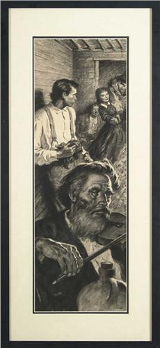 AMOS SEWELL (American, 1901-1983) BLACK AND WHITE ILLUSTRATION. Graphite on paper illustration shows a violin player with family in background. Signed lower right. Housed in a modern flat black frame with white and black mattes. SIGHT SIZE: 31-1/4" x 10-1/4". CONDITION: Very good. 9-27343