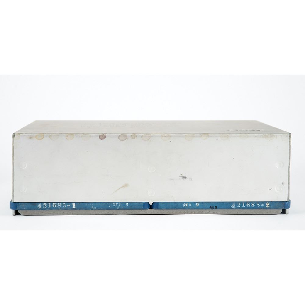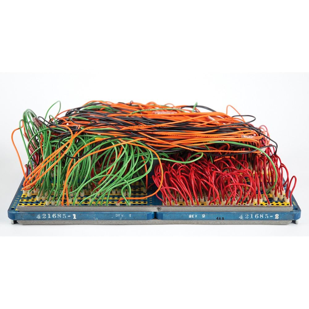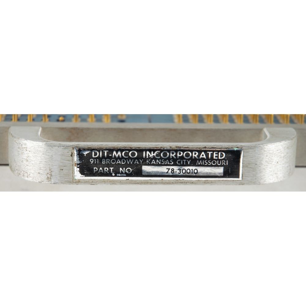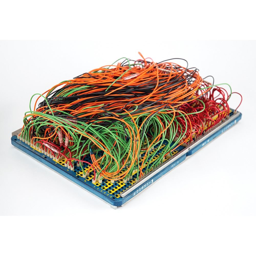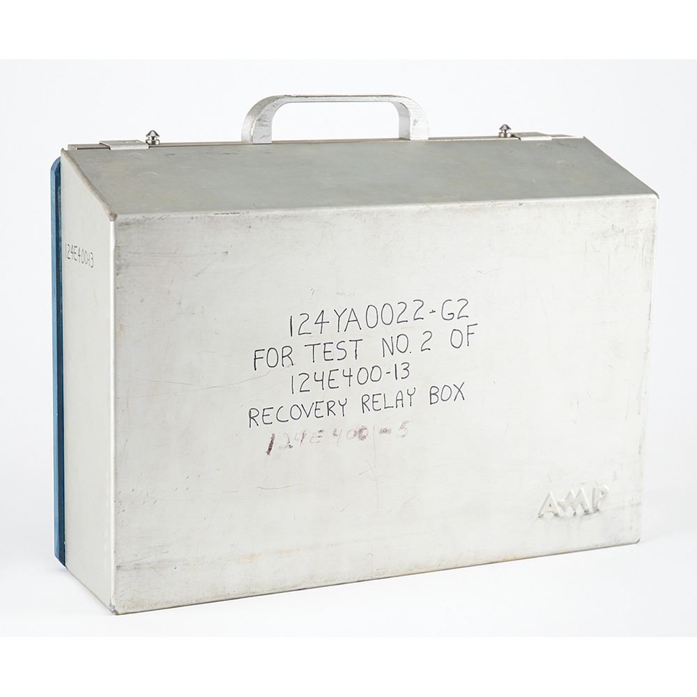 Analog Computer Patch Board made by AMP Incorporated, housed in its original metal carrying case, 13.25 x 9.5 x 4, which is marked in felt tip on the front cover, “124YA0022-G2, For Test No. 2 of 124E400-13, Recovery Relay Box,” with the sides similarly marked as “124E400-13.” The cover can be removed to reveal a profusion of green, orange, red, and black wires, and the inside of the front cover contains an AMP parts label numbered “695217-2,” with a manufacturing date of “73-43.” The upper handle bears a DIT-MCO Incorporated parts label numbered “78-30010.” In fine condition, with light wear and scuffing.