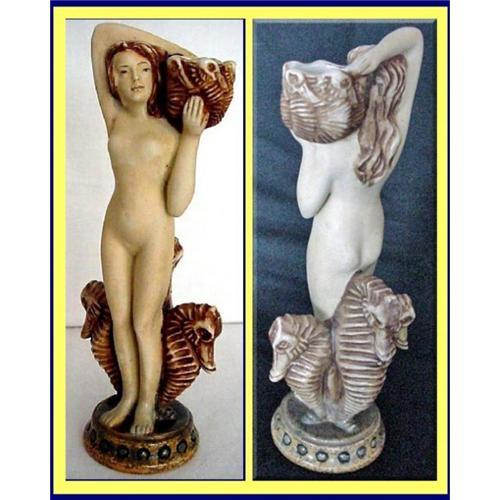 Unusual Amphora figure of a nude with seahorses and holding a basket shaped as strange birds and rabbits. Made in Chechoslovakia 1918-1939.<BR>Measures 8 1/2inches high.<BR>A slim young lady with long, flowing hair stands on a round base, modelled with typical Amphora impressed and inset beads. Around the base are 3 strange seahorses, wonderfully modelled in exotic forms and very graceful. The girl holds a basket on one shoulder. It is made in the form of a ring of rabbits and pelican like birds with long beaks - beautiful, but almost grotesque. Very exciting forms of these animals echo the folds of the seahorses and contrast with the smooth skin of the girl.<BR>Underneath is a blue underglaze oval with Made in Czechoslovakia around the word Amphora, the mark used 1918-1939. Impressed numbers 20192 and 26.<BR>Condition is excellent. No chips/cracks/scratches/restorations of any sort.