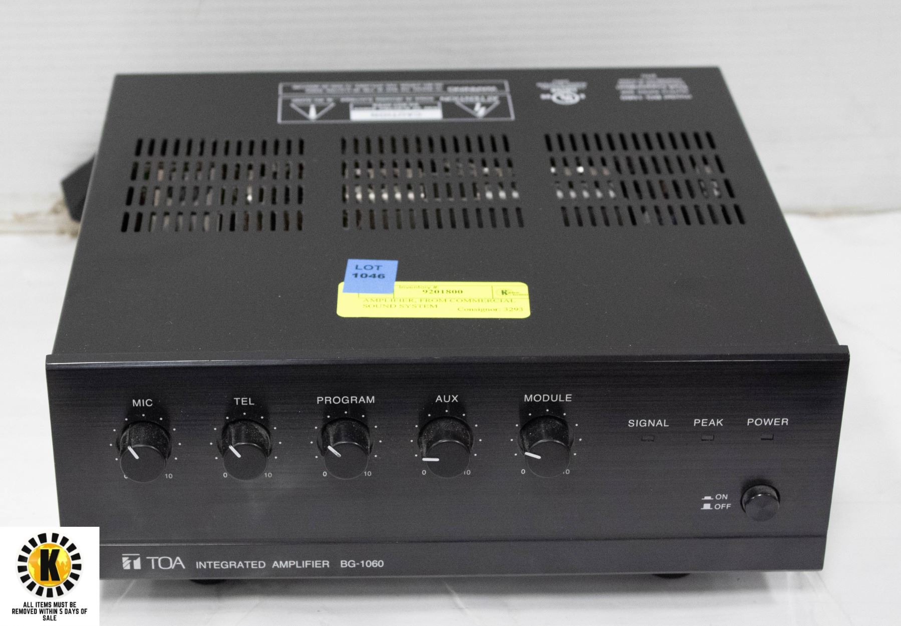 FOR RESTAURANT OR STORE, TOA INTEGRATED MODEL BG-1060 60 WATTS **ALL ITEMS MUST BE REMOVED BY 5PM SATURDAY, AUGUST 26TH 2023. ALL REMAINING ITEMS WILL BE SUBJECT TO A $6.00 PER DAY STORAGE CHARGE. ANY ITEMS REMAINING AFTER MONDAY, SEPTEMBER 11TH, 2023 WILL BE CONSIDERED FORFEITED. NO REFUNDS WILL BE ISSUED FOR FORFEITED ITEMS. TO SCHEDULE A PICK UP APPOINTMENT CLICK HERE