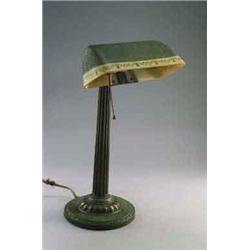AMRONLITE, USA Büroleuchte, Metall, Glas. Runder Fuß mit hohem, kanneliertem Schaft, grün und gold bemalt, reliefierter und bemalter, sowie verstellbarer Glasschirm, alt elektrifiziert. H.: 47 cm. Bez.: Firmenmarken AMRONLITE, Made in USA Patented 1917. 1917