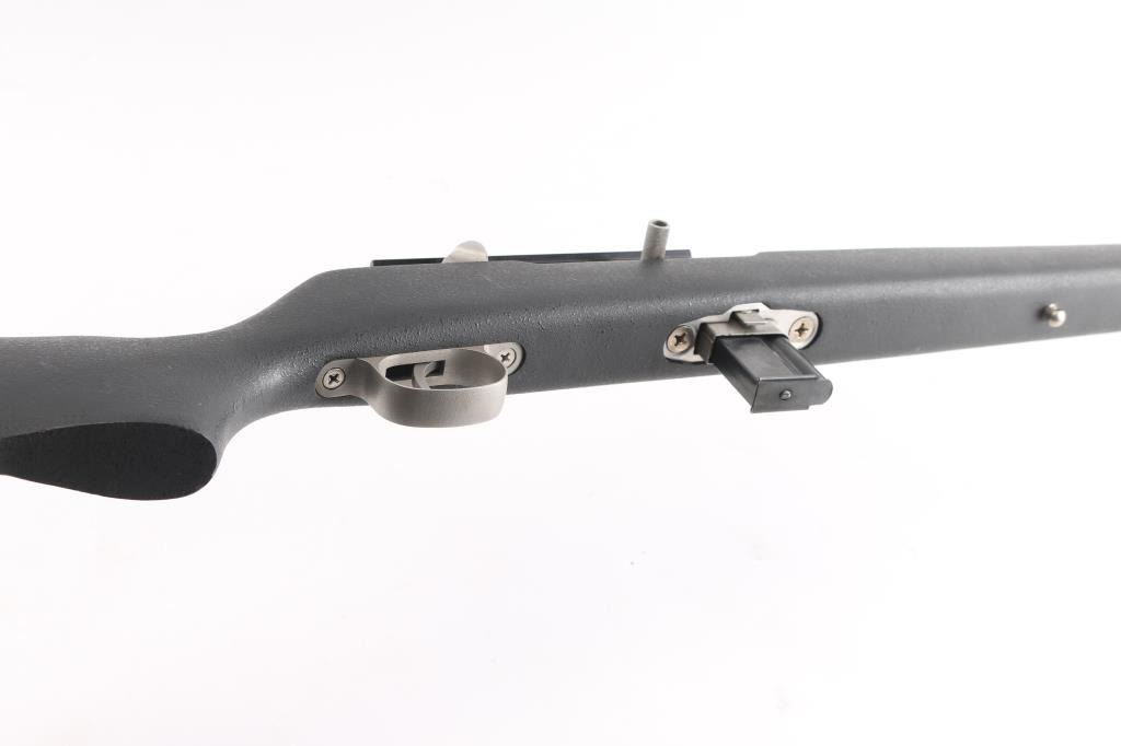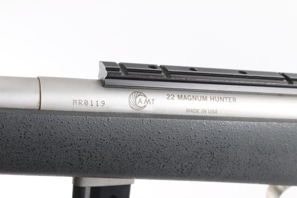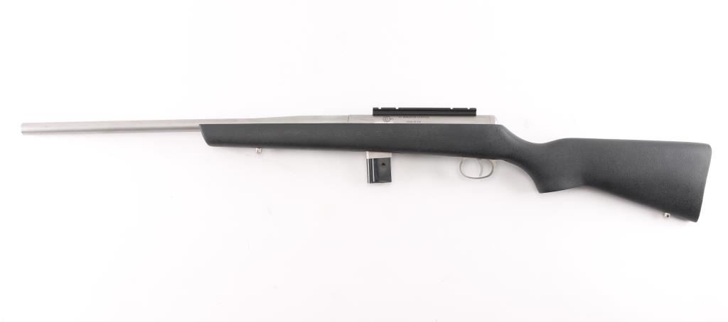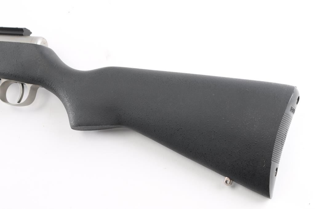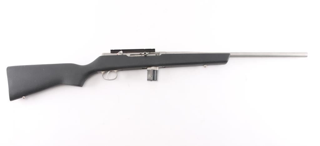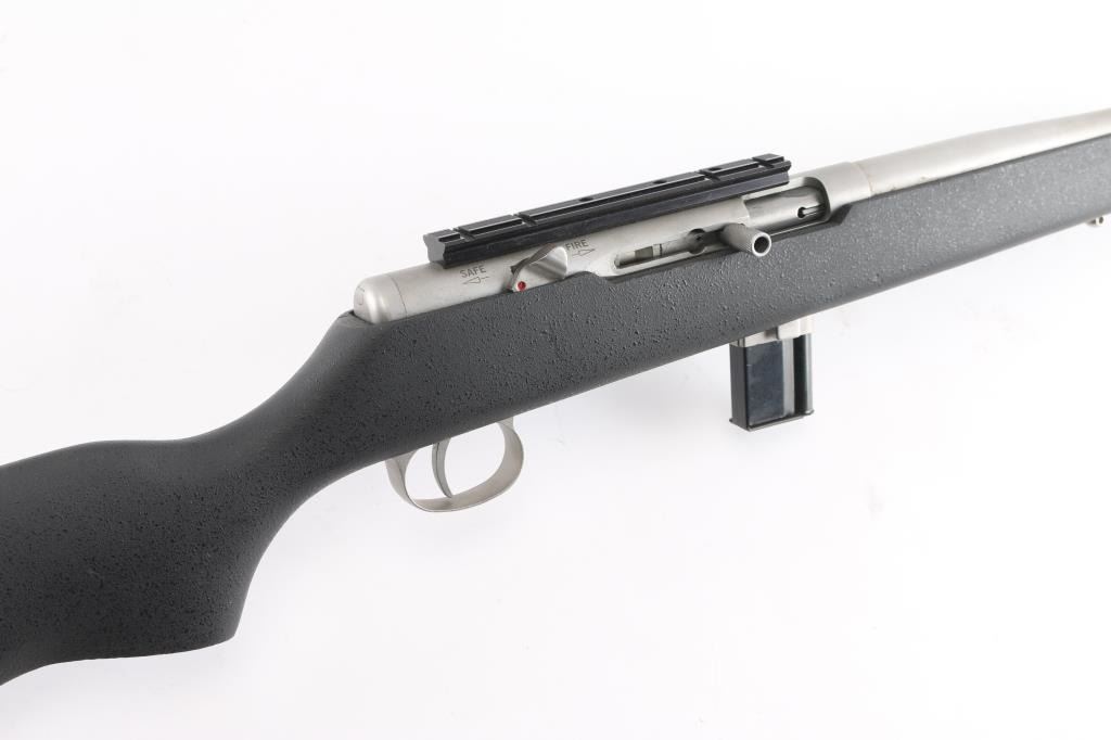 Semi automatic 22 Magnum with matte stainless steel finish, 20" heavy target barrel, no provisions for sights, manual safety, and black synthetic stock, sling swivel studs, scope rail installed on receiver. Bore is excellent/bright. Overall excellent. Includes one 10 rd magazine.