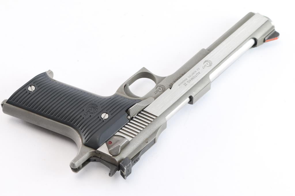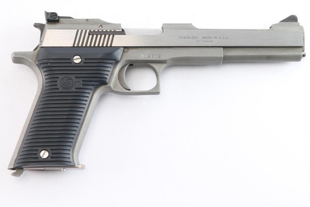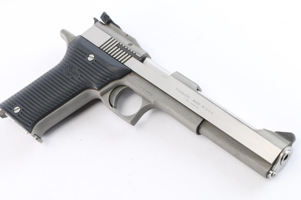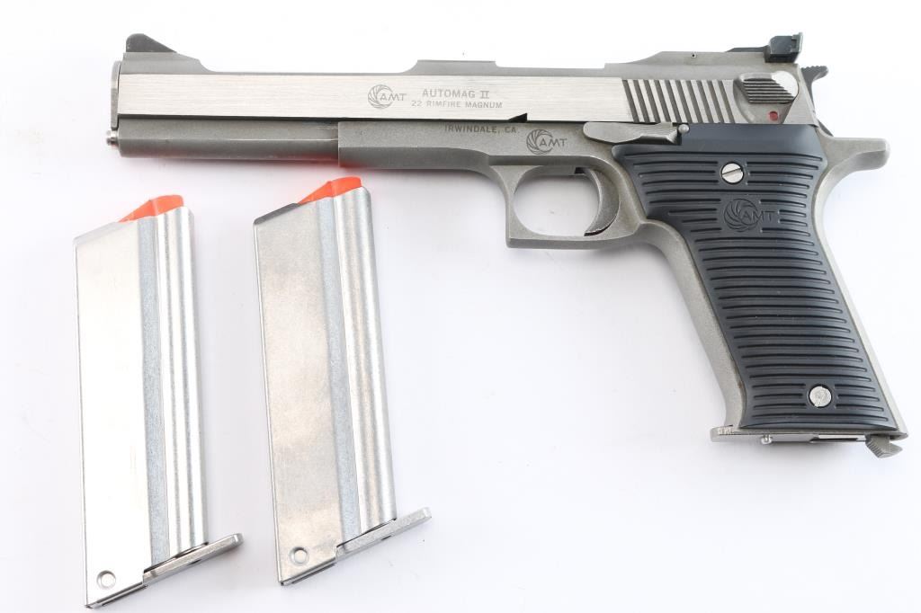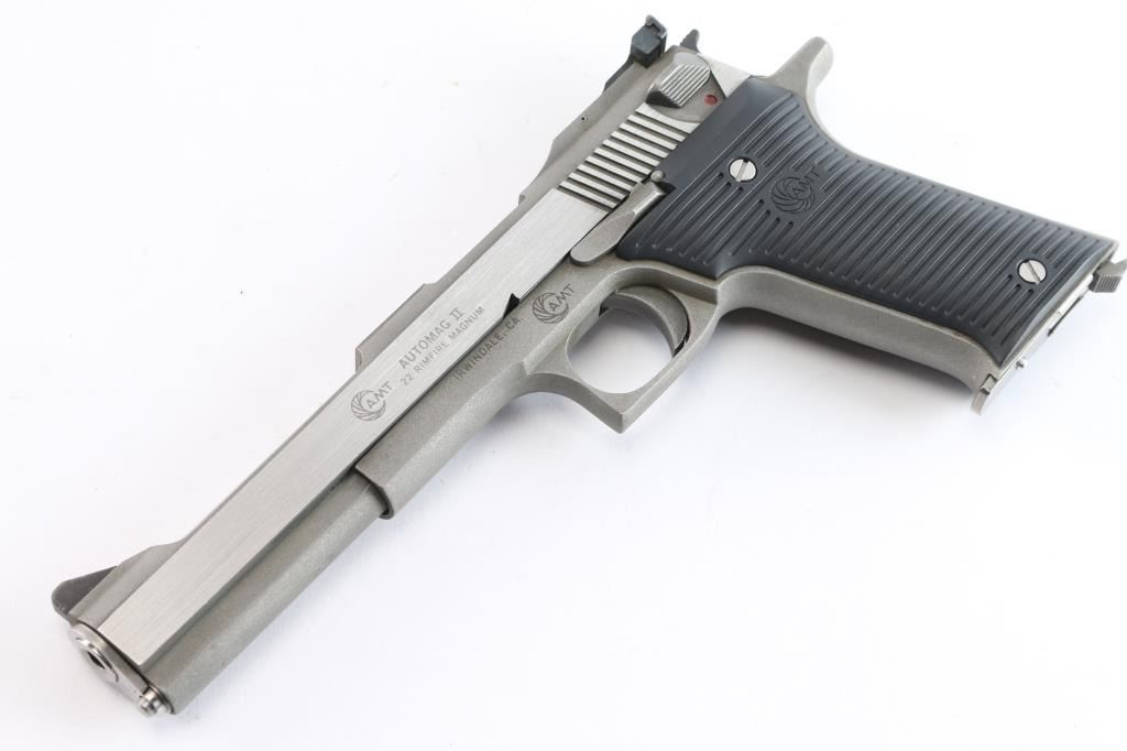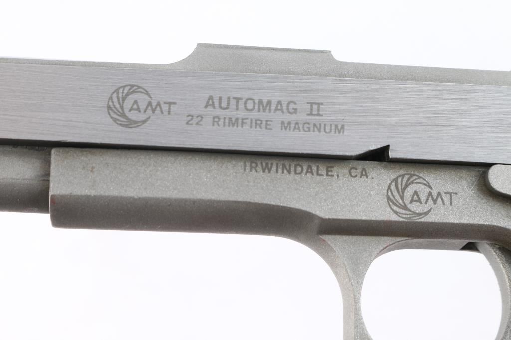 Stainless steel single action semi-automatic pistol chambered in .22 Magnum, manufactured by Arcadia Machine & Tool in Irwindale CA, circa 1990’s. Features a matte/brushed finish, 6" barrel, full-length steel guide rod, red ramp front & white outline adjustable rear sights, smooth trigger, serrated hammer spur, manual safety on the left side of the slide, heel magazine release, 10 round magazine, and two-piece grooved black synthetic grips with AMT insignias. Bore is excellent/bright. Pistol exhibits minor wear, signs of light use including minor scratches.. Comes with two spare magazines, (3) total.
