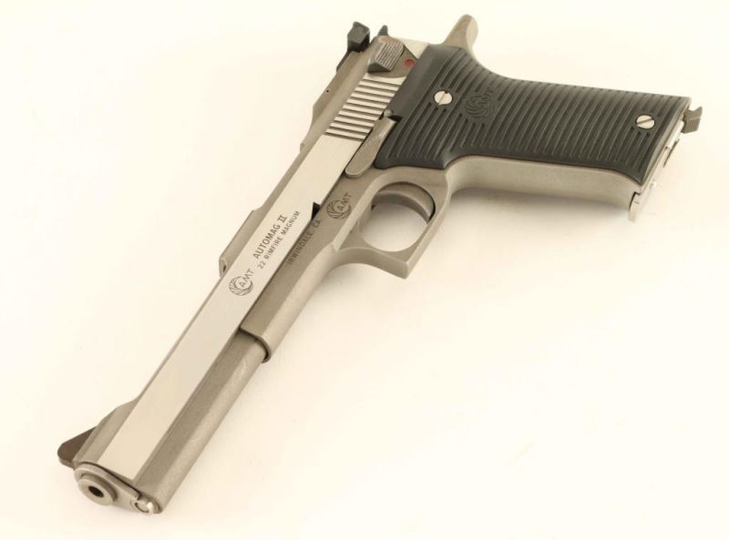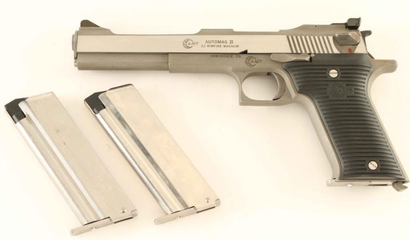 Stainless steel single action semi-automatic pistol chambered in .22 Magnum, manufactured in Irwindale, C.A. circa 1990's. Features a brushed & matte finish, 6" barrel, full-length steel guide rod, ramp front sight with orange accent, Millett adjustable rear sight with white outline, smooth trigger, serrated hammer spur, manual safety on the left side of the slide, heel magazine release, 10 round magazine, and two-piece grooved back synthetic grips with AMT insignias. Includes two spare magazines. Pistol exhibits little wear but shows some light scattered surface rust. Action is crisp, the bore is good with what appear to be minor pitting and the synthetic grips are fine. Condition is NRA Good. ***Modern Firearm***