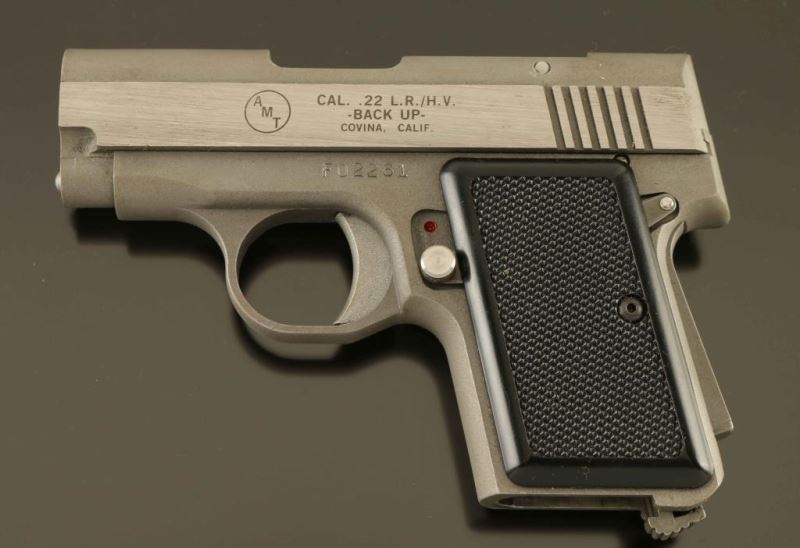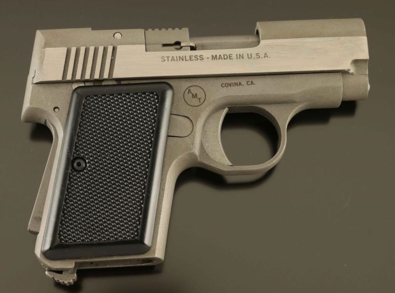 Stainless steel small frame single-action semi-automatic pocket pistol chambered in .22 Long Rifle, manufactured in Covina, C.A. circa 1980's. Features a brushed/matte finish, 2.6" barrel, fixed sights, manual safety on the left side of the frame, grip safety on the back strap, smooth trigger, heel magazine release, no magazine, and checkered two-piece black plastic grips. Includes a cardboard box numbered to the gun with fitted plastic insert, parts list, a .380 6 round magazine with finger rest floorplate and a .22 caliber magazine missing the lock plate with a broken floorplate. Pistol exhibits only light handling marks with no major wear observed. Action is smooth, bore appears excellent but dirty and the plastic grips are fine. Condition is near NRA excellent. ***Modern Firearm***