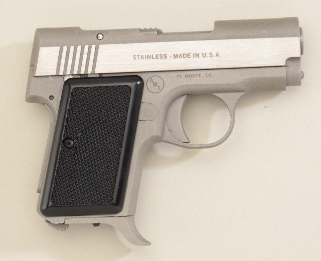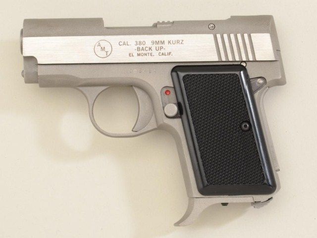 AMT Back-Up Model semi-auto pistol, out-of-production, .380 cal., #D05424; near excellent condition, slight use only. Est.: $150-$300.