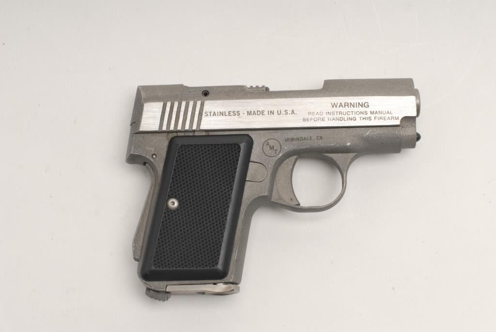 AMT Back Up semi-automatic pistol, .380 cal., serial #G00712. The pistol is in good overall condition with a 2 ½” barrel. The brushed nickel finish is very good overall with losses on the frame and at the muzzle. The checkered plasticgrips are in good overall condition with only minor handling marks noted. The bore is very good, the action crisp and markings are sharp. Est.: $175-$350. (Modern).