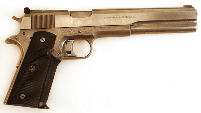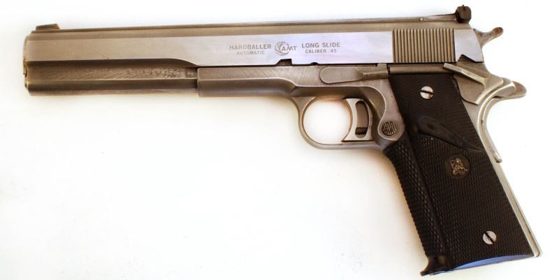 Hardballer Long Slide 1911 style .45 ACP pistol, by AMT of El Monte, CA. Features 7 inch barrel, with stainless steel finish, skeletonized trigger, and Pachmayr rubber grips. Good bore, with some powder fouling. Stainless finish is about 85%, with some scuffs and handling, and grips are good. Some powder fouling evident, easily removed with take down cleaning, otherwise gun is in overall good to very good condition. Caliber: .45 ACP Serial #: A09951