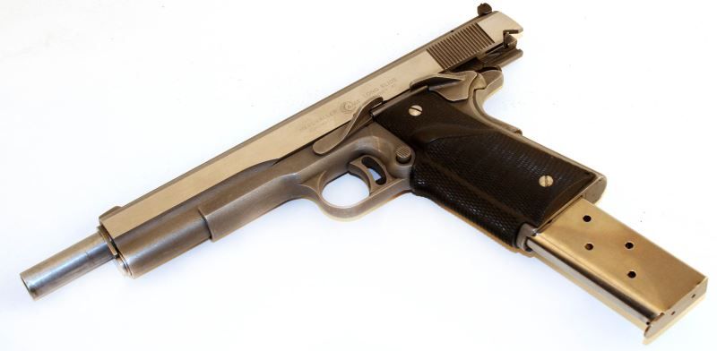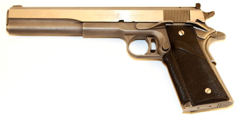 Hardballer Long Slide 1911 style .45 ACP pistol, by AMT of Covina, CA. Features 7 inch barrel, with stainless steel finish, skeletonized trigger, extended slide release, and rubber grips. bore is very good, with some powder fouling in grooves, easily cleaned. Stainless finish is about 90%, with some scuffs and handling, and grips are good. Some powder fouling evident, easily removed with take down cleaning, otherwise gun is in overall very good condition. Caliber: .45 ACP Serial #: A19932
