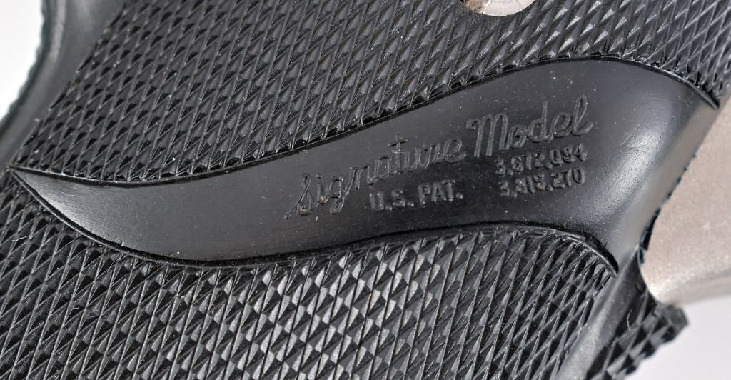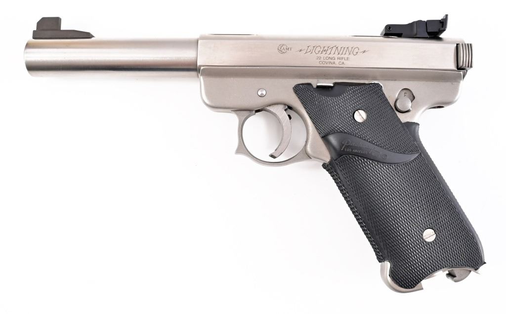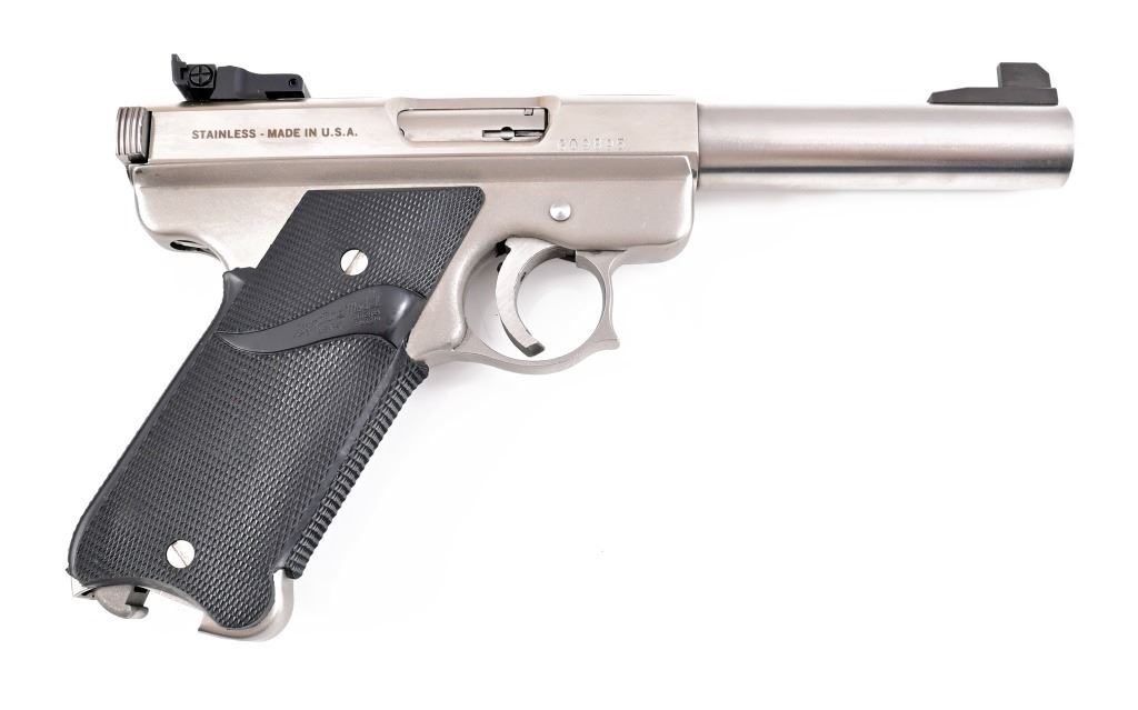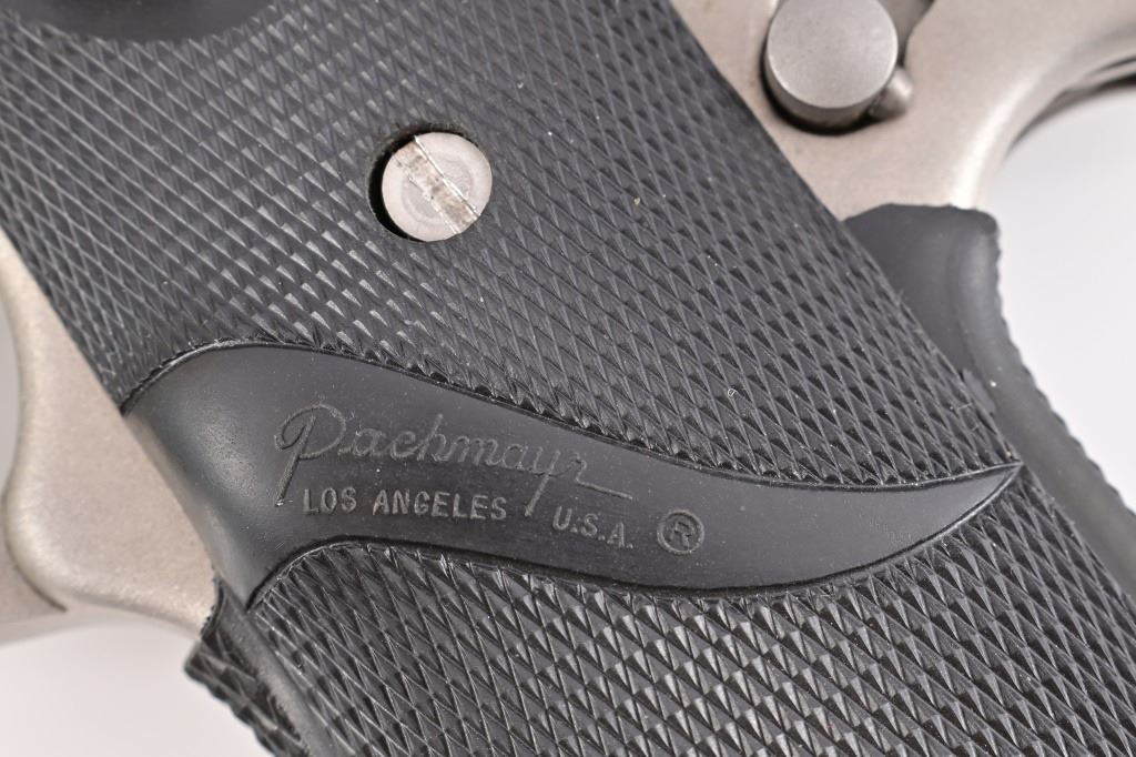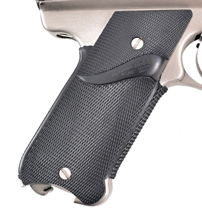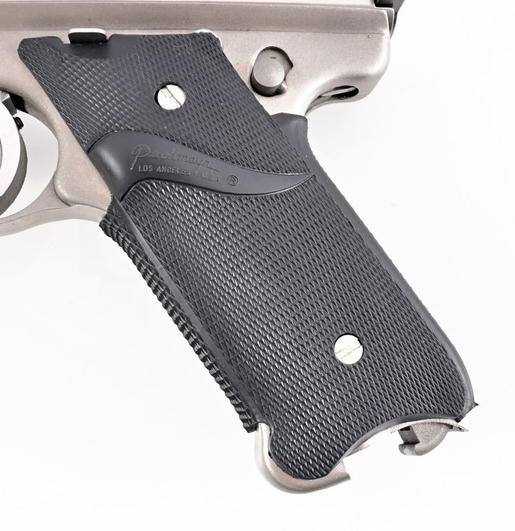 S/N G09895. Stainless finish with Pachmayr Signature Model rubber grips, 5" barrel. Good condition, missing magazine.