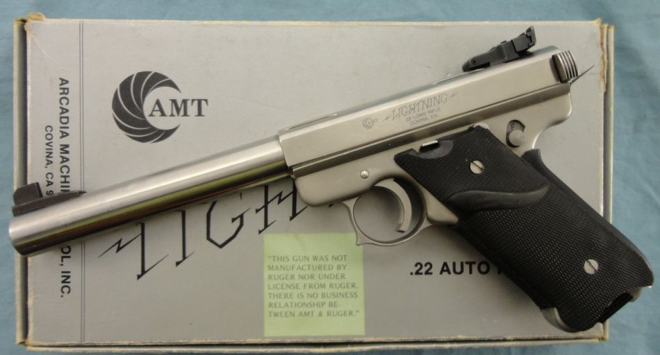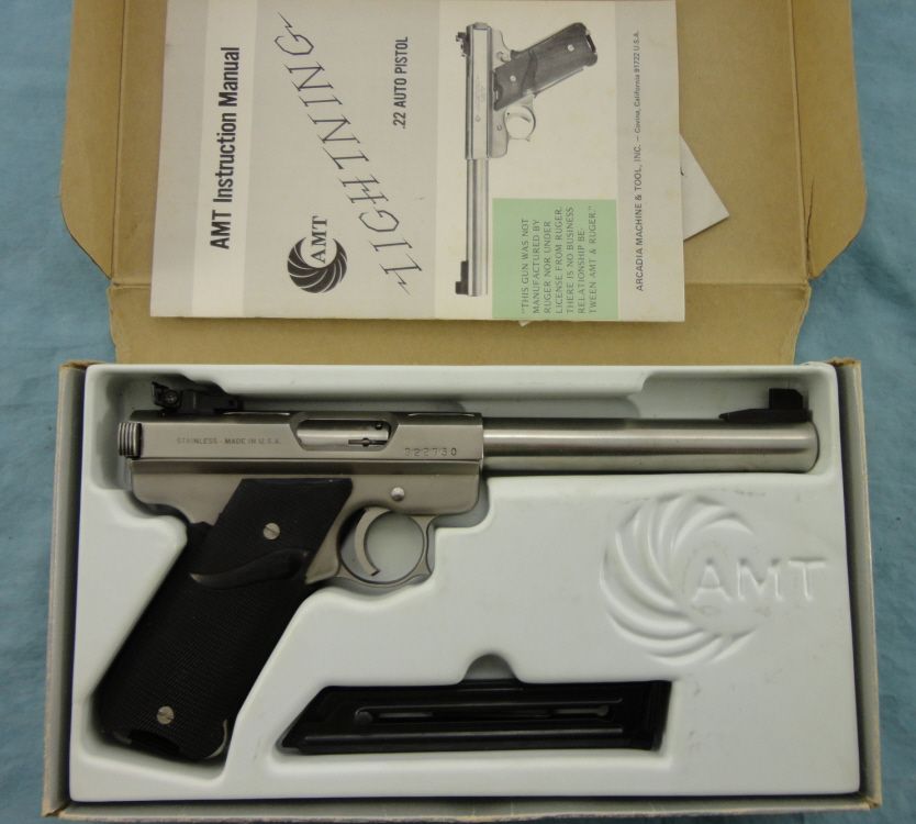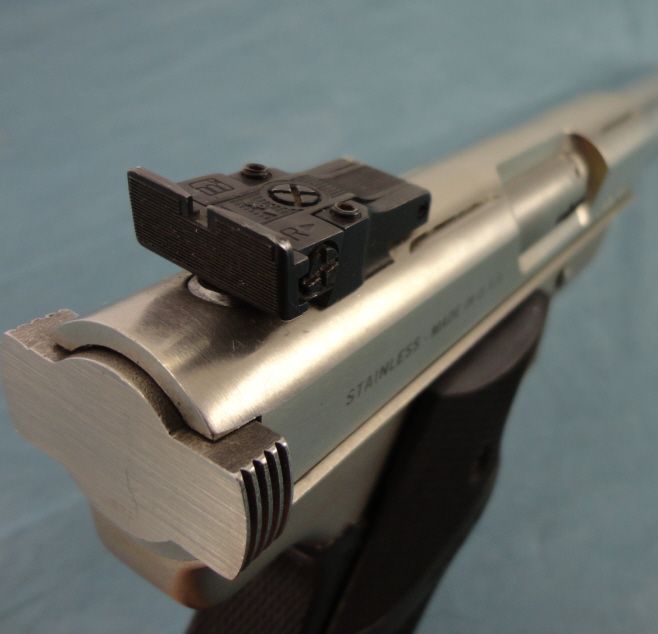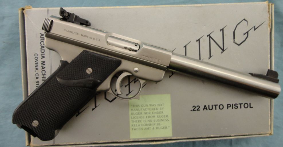 #G22750; 22cal. SS finish 6.5" bull bbl. w/adj. rear sight. Condition appears to be as new w/original box w/some marks from storage. Mfg. 1984-1987.