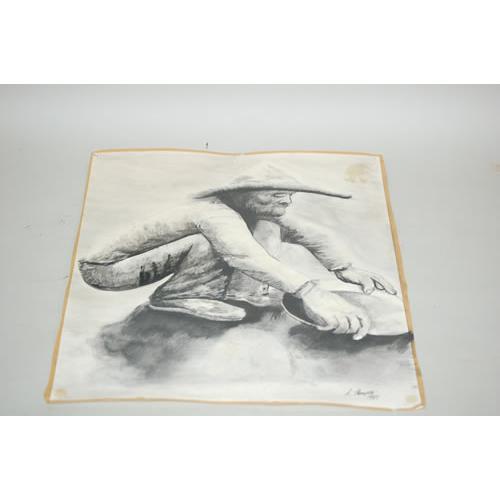 AMY THOMPSON WATERCOLOR ON PAPER PORTRAIT OF A BEARDED MAN SQUATTING & PANNING FOR GOLD UNDER THE SHADE OF HIS WIDE BRIMMED HAT-SIGNED A. THOMPSON 1982 ON LOWER RIGHT, UNFRAMED (21" X 15") - WEAR, SOILING, TACK HOLES, IMPERFECTIONS