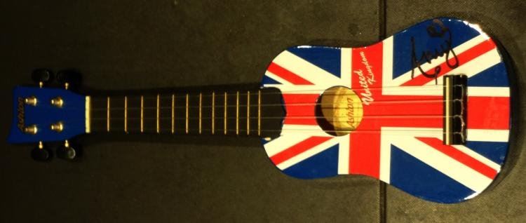 A Ukulele: Union Jack design signed by British signer Amy Winehouse in black sharpie. Condition Report: Good. With some chips of paint missing.