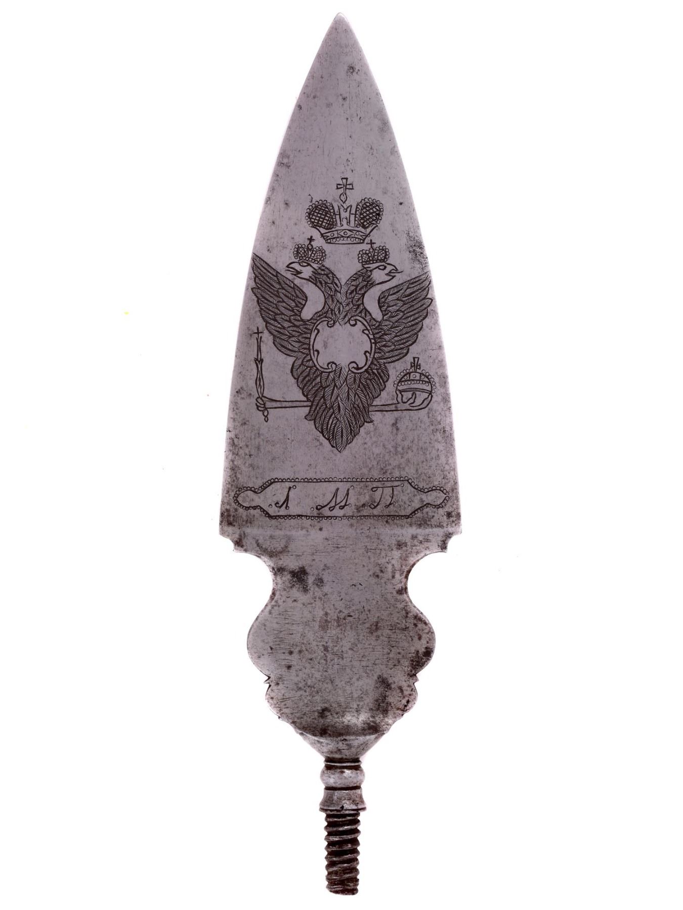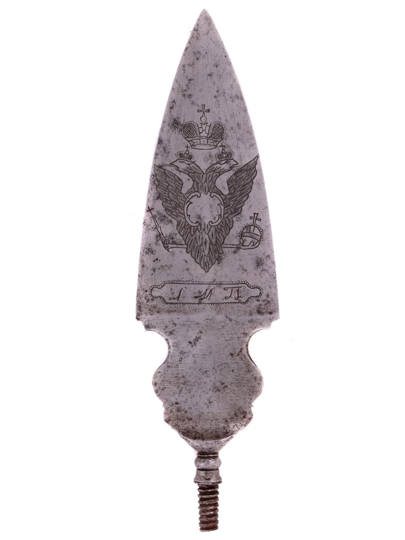 A rare M1797 Russian Imperial Army officer's spontoon head. There are three letters in Cyrillic "Л. М. П." on each side below the coat of arms. The last two letters stand for "Musketeer Regiment" (Мушкетерский полк).