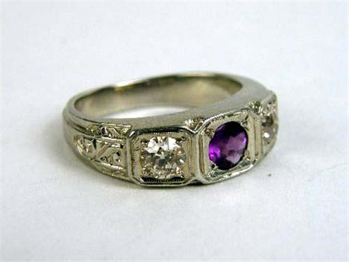 Containing a center round amethyst flanked on either side by a one old European cut diamond, toal diamond weight apx. .60cts, gross weight apx. 4.2dwts.
