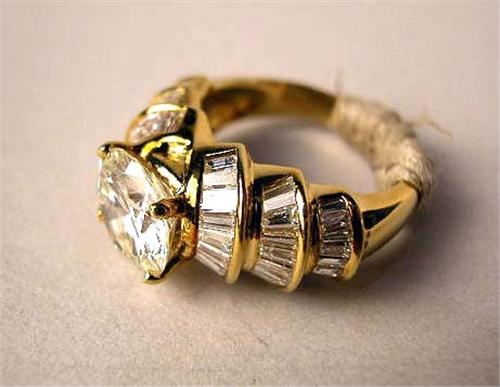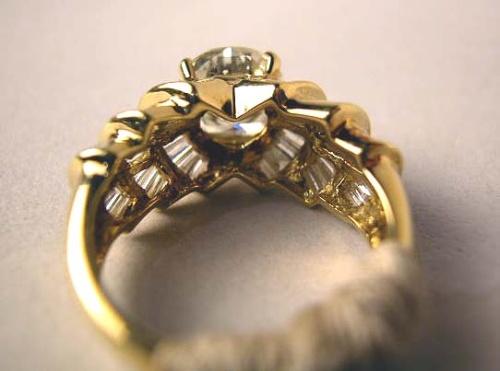 AN 18K YELLOW GOLD, DIAMOND AND GOLD DINNER RING With a round brilliant cut diamond and fifty-four baguette diamonds, total weight apx. 2.69 carats, clarity VS2, color slightly tinted K-L, stamped "18K