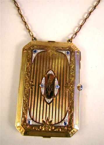 AN 18K YELLOW GOLD DIAMOND AND SAPPHIRE MINAUDIERE; Monog. center A.G.T., the interior fitted with mirror, calling card case, note pad, pencil and compartments, 3-1/2" x 2-1/8"