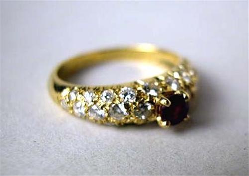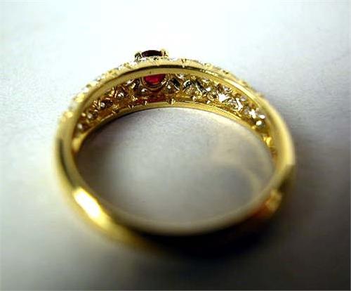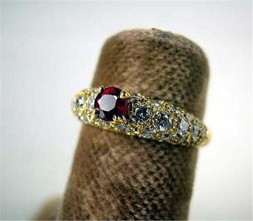 AN 18K YELLOW GOLD FRENCH DIAMOND AND RUBY RING Stamped with the French hallmark of the eagle head for 18-karat gold, with one natural ruby, round mixed cut, estimated weight apx. 0.25 carat, and thirty full cut diamonds, total estimated weight apx. 0.70 carat, clarity VS1/VS2, color H-I