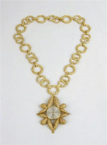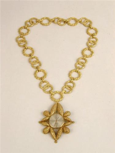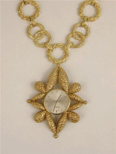 Watch mounted by brushed hand-hammered gold setting, weight apx. 7.6 T.O. Wwatch 1"dia., pendant 3 1/2"l x 3"w , chain apx. 24"l x 1"w