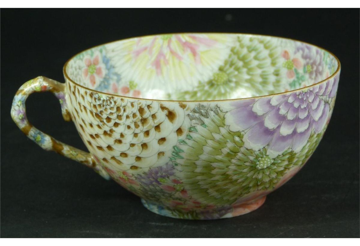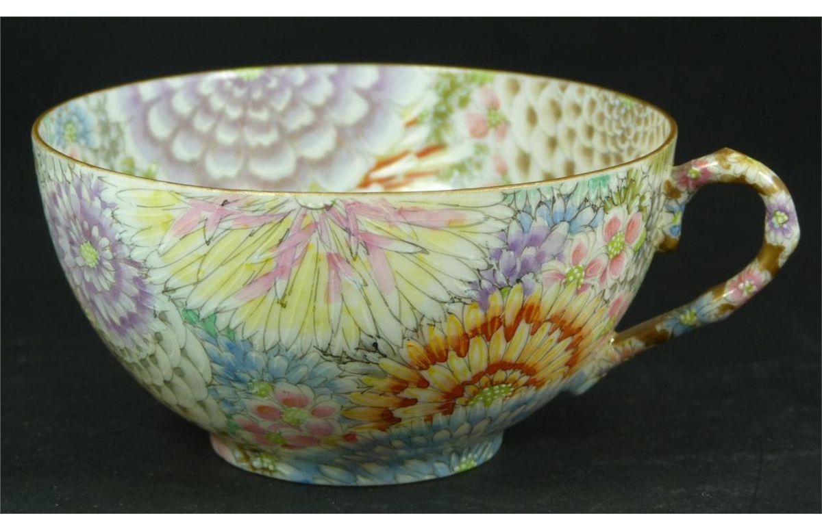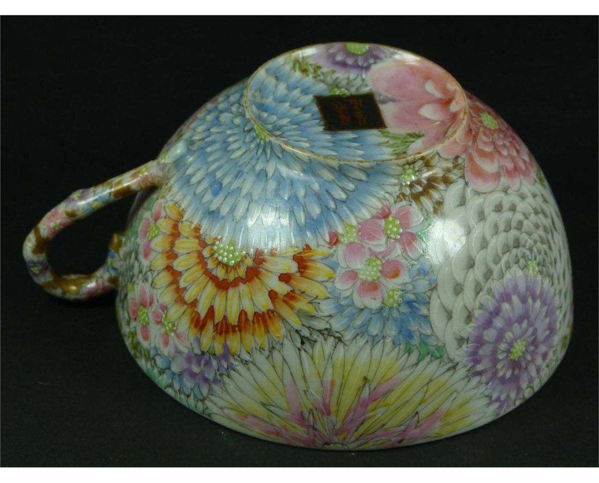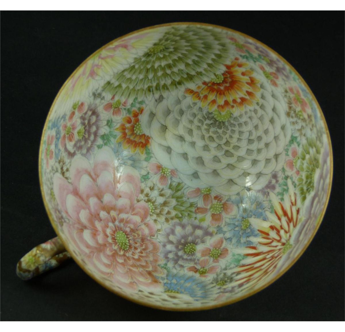 An antique Imperial hand painted eggshell porcelain tea cup having a floral design throughout interior and exterior. Holds calligraphy marks to bottom. Early to mid Qing dynasty period. Measures 1 7/8" height (4.7cm). Total weight of 43 grams.