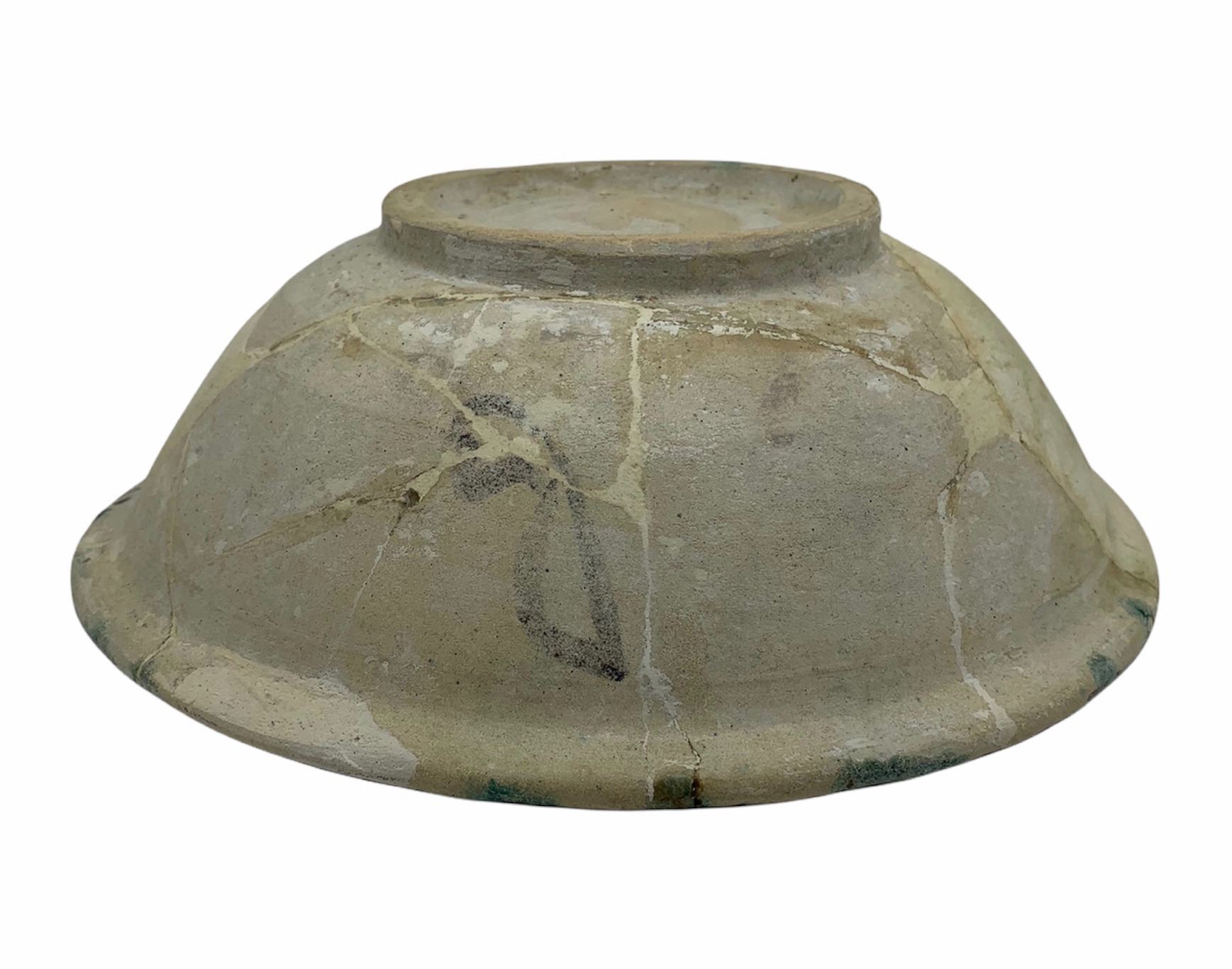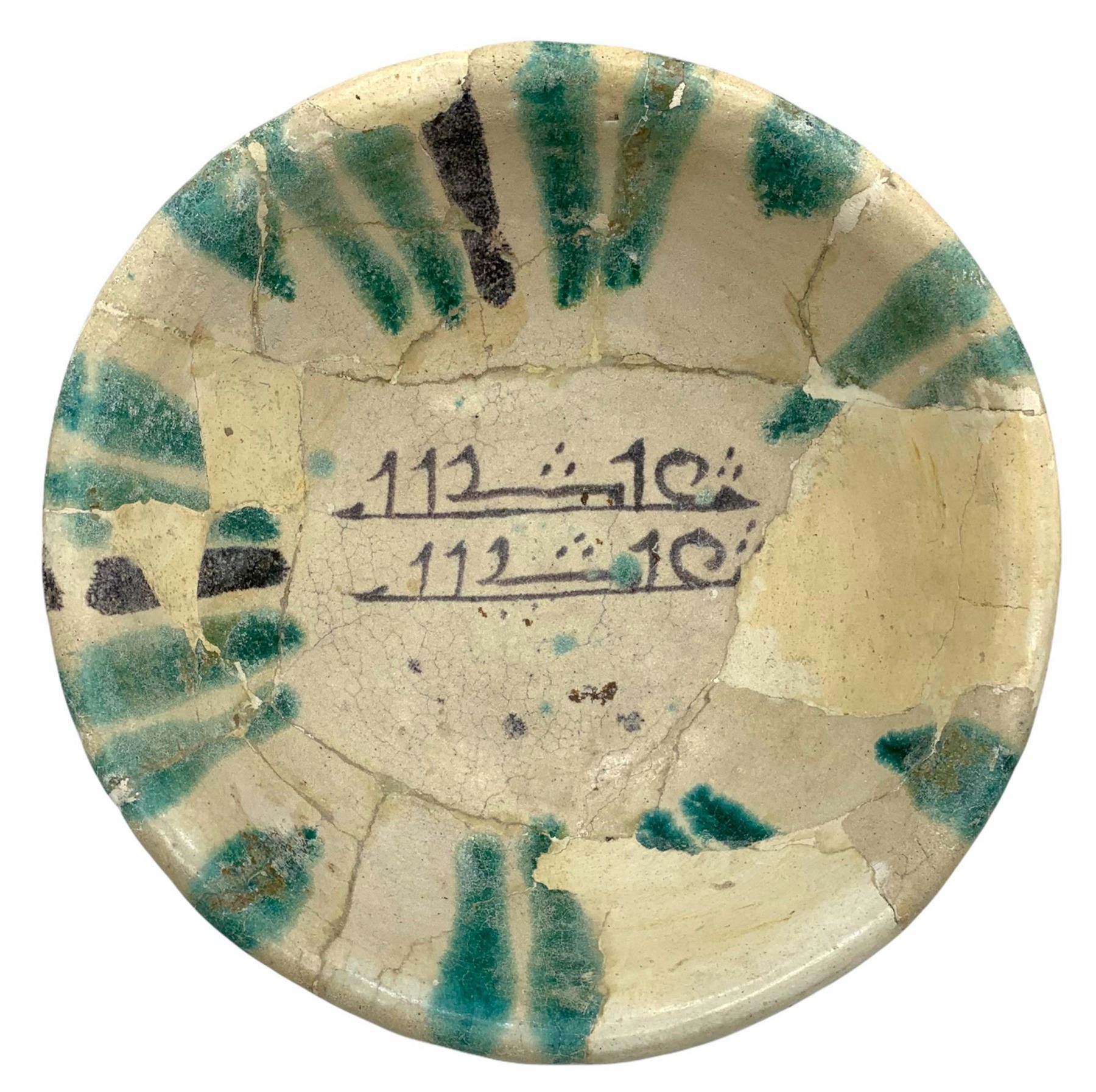 A RARE ISLAMIC ABBASID CALLIGRAPHIC TIN-GLAZED POTTERY BOWL MESOPOTAMIA CIRCA 9TH CENTURY. the milky white ground with two bands of kufic inscription in cobalt-blue, manganese and green, with many panels of pseudo-Chinese splash effect. Inscriptions: repeat of possibly word 'ghibtah', means 'alacrity' or 'abdahu 'His (God's) servant' . This rare and elegant bowl with its shallow bowl and low foot is based on a Chinese prototype; the splashed design and calligraphic inscription, however, are entirely Islamic. Interestingly, other examples of "Basran" ceramic productions are signed; a fashion which is likely due to the skill and accomplishment of the potter. Size: 24 cm diam. For a Similar Example