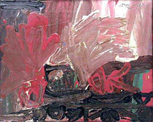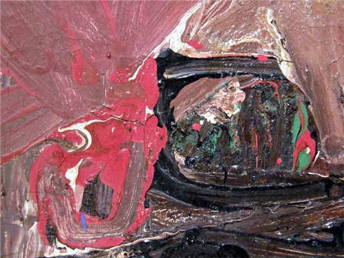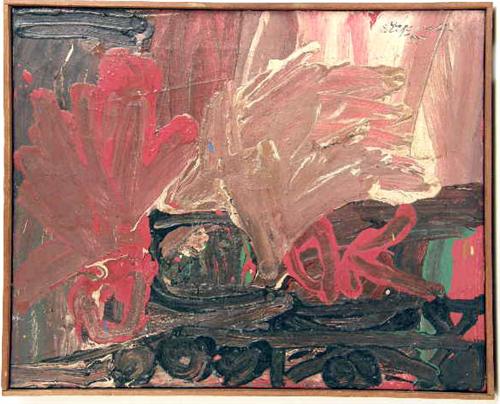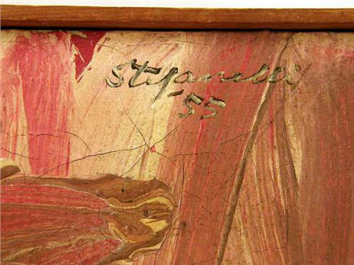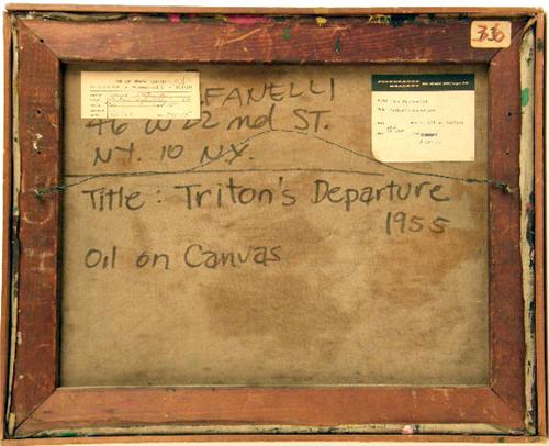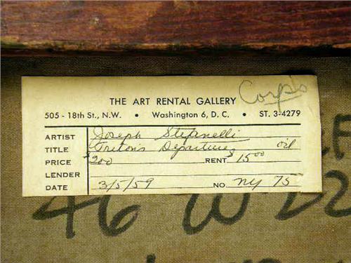 Signed Stefanelli `55 (Joseph Stefanelli, American, b. 1921), signed and titled on the canvas verso, "Joe Stefanelli/46 W. 22nd St./NY 10 NY/Triton`s Departure/Oil on Canvas", and with a label from the "Poindexter Gallery/21 West 56/NYC 19" giving artist, title, medium, size, price and a date of 1955. Further with a dated label from the "Art Rental Gallery, 505 18th St. NW Washington 6, DC/ST.3-4279, 3/5/59", noting that it cost $15 to rent this painting. Sight size 16 1/4"h x 20"w Paint cracks but no losses to several heavily-impastoed areas of the canvas.