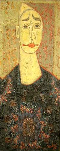 AN ABSTRACT OIL ON CANVAS; depicting a female (?) clown, signed l.r. Zenkel 56. Together with an oil on canvas of the Modligiani-esque head of a woman, signed l.r. Russo '62. 2 pieces. The first 28" x 11 1/2"