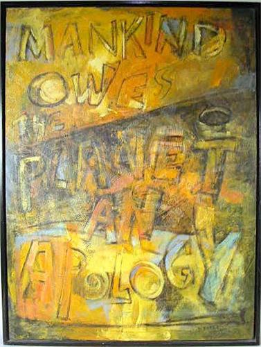 Titled "Mankind Owes the Planet an Apology, 1988", by Catherine Bates, unsigned. 40"h x 30"w.