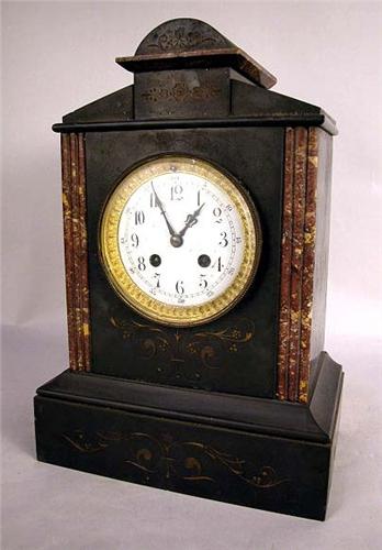 AN AESTHETIC MOVEMENT MIXED STONE AND GILT METAL MANTLE CLOCK; Of rectangular form with two reeded supports centering a white enamel dial 13 1/2"h x 9 1/2"w x 5 3/4"d