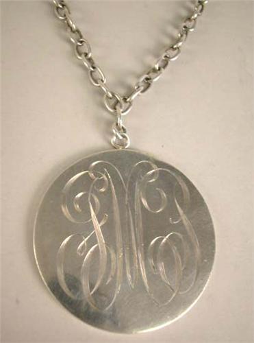 AN ALLEN ADLER HANDMADE LARGE STERLING SILVER CIRCULAR MONOGRAMMED DISK PENDANT ON CHAIN; Disk, 3-3/4"dia., chain 20", apx. 5 T.O.