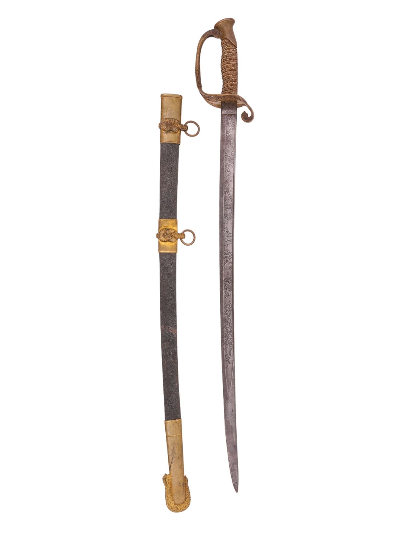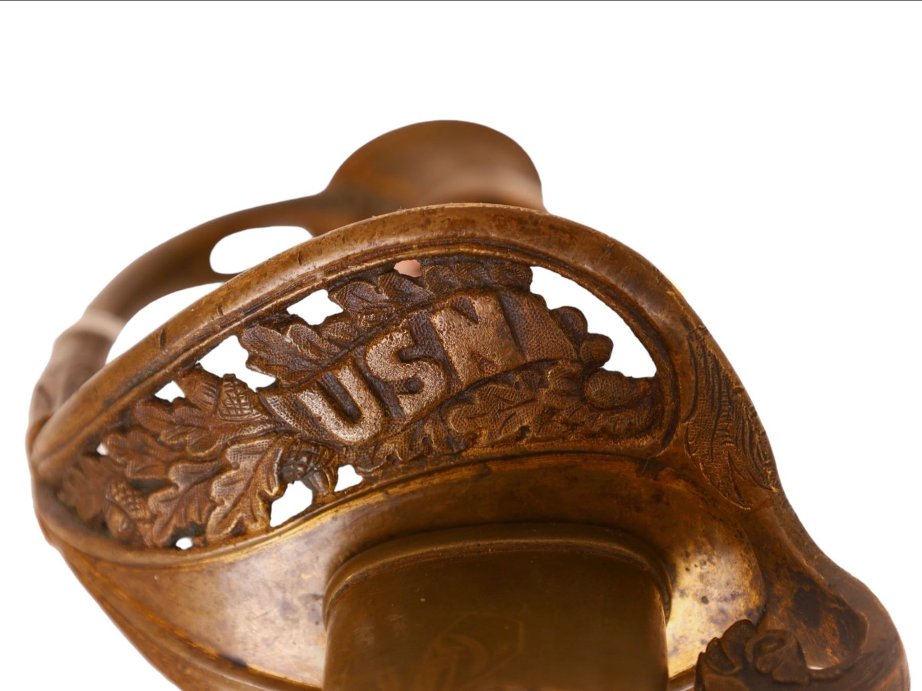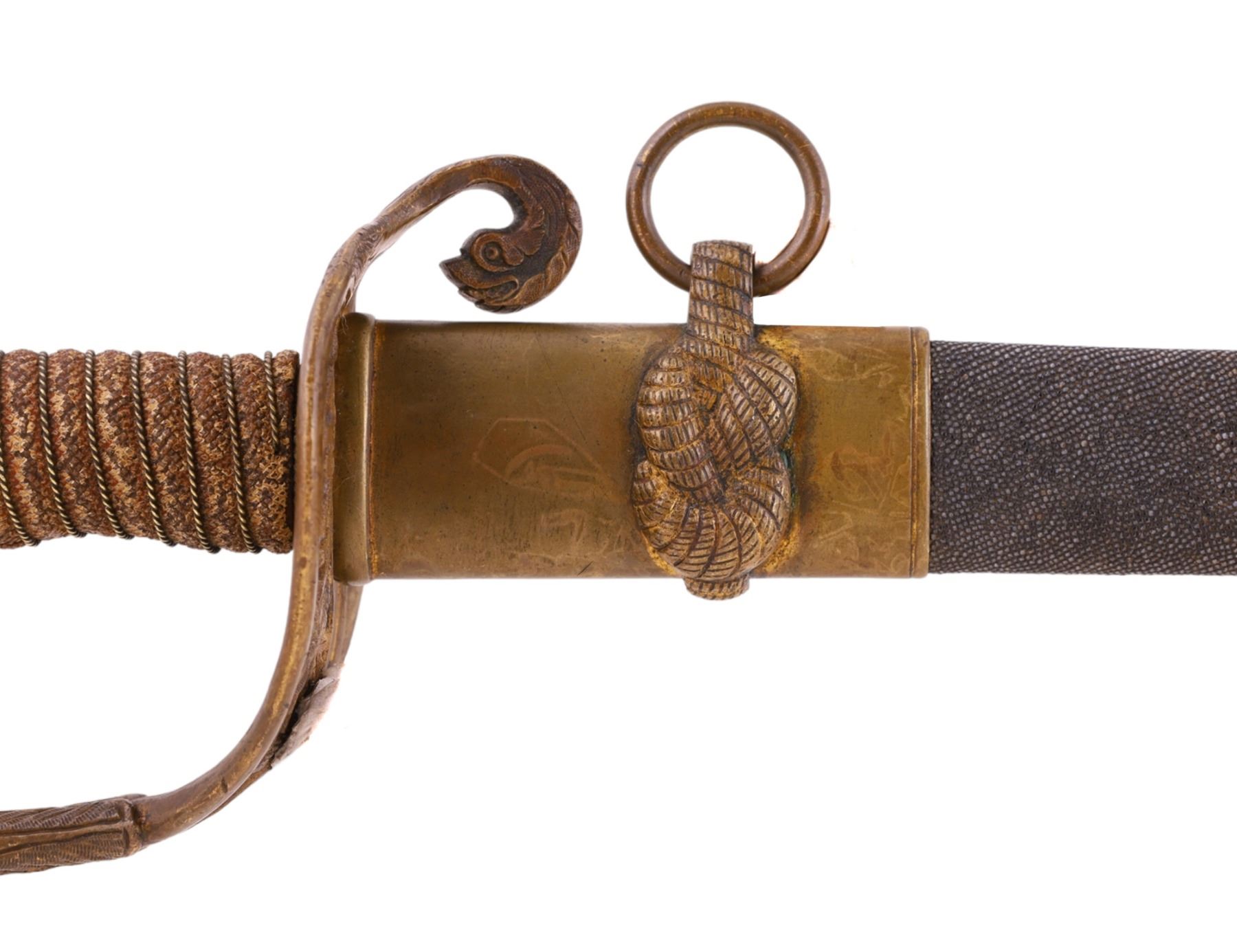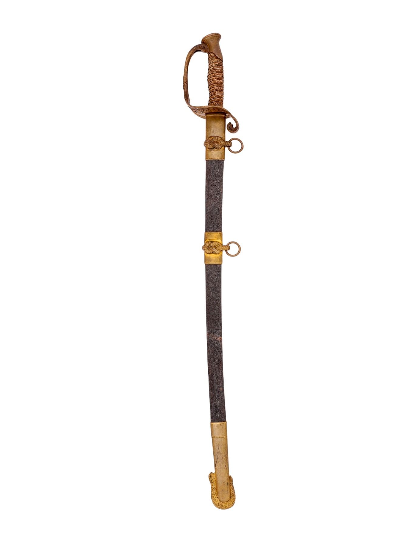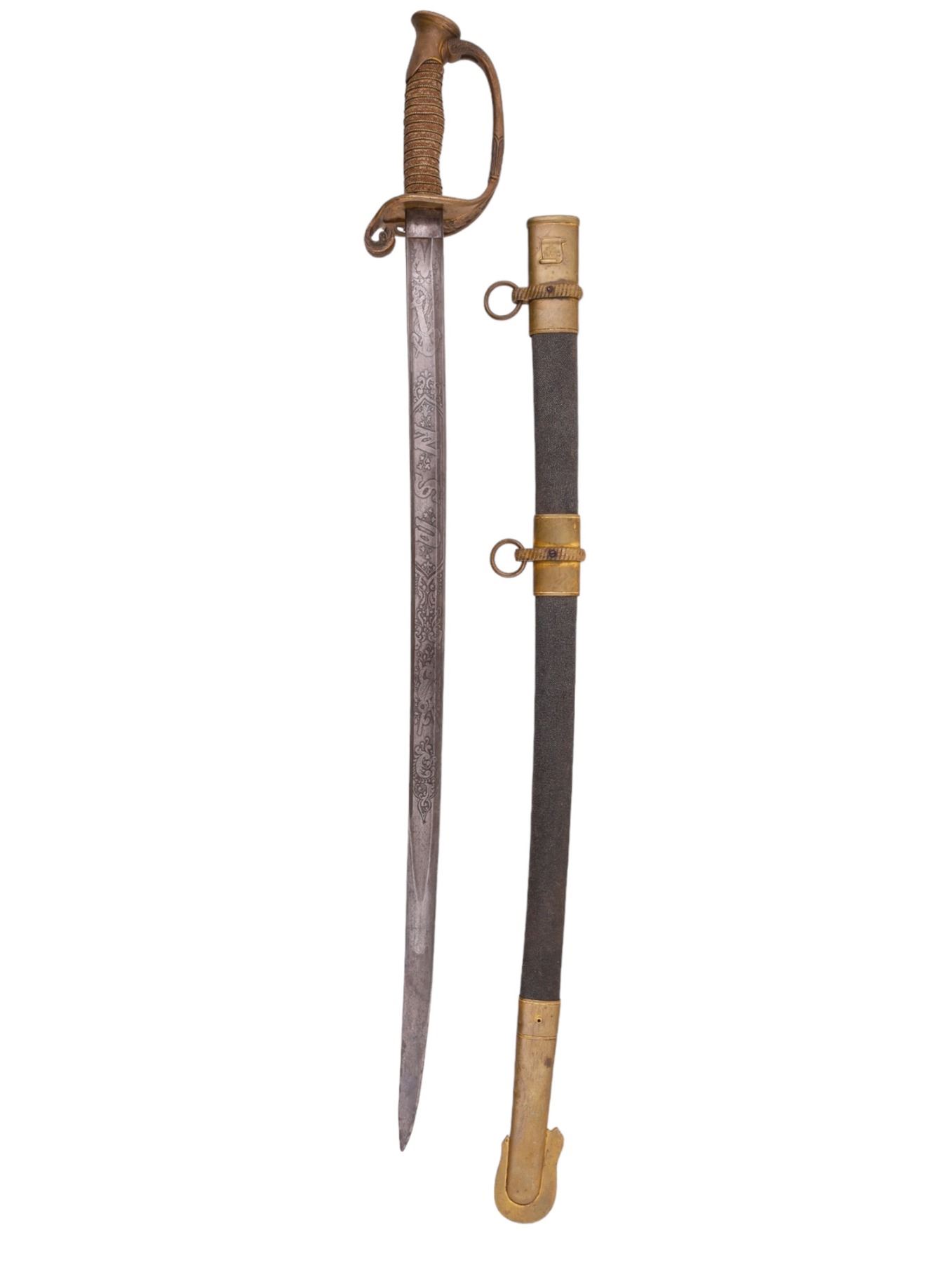 Civil War M1852 US Naval officer's sword and scabbard by Horstmann & Sons, PA. The blade is etched for two-thirds of its length with naval ships on one side and the USN and anchors. The blade is clean with very minor expected signs of wear, with the original buff leather washer. The sharkskin grip and wire wrap are excellent. The original sharkskin scabbard is in good condition. The pommel is engraved with an anchor, and the scabbard throat features a brass plaque with "Horstmann and Sons Makers Philadelphia".