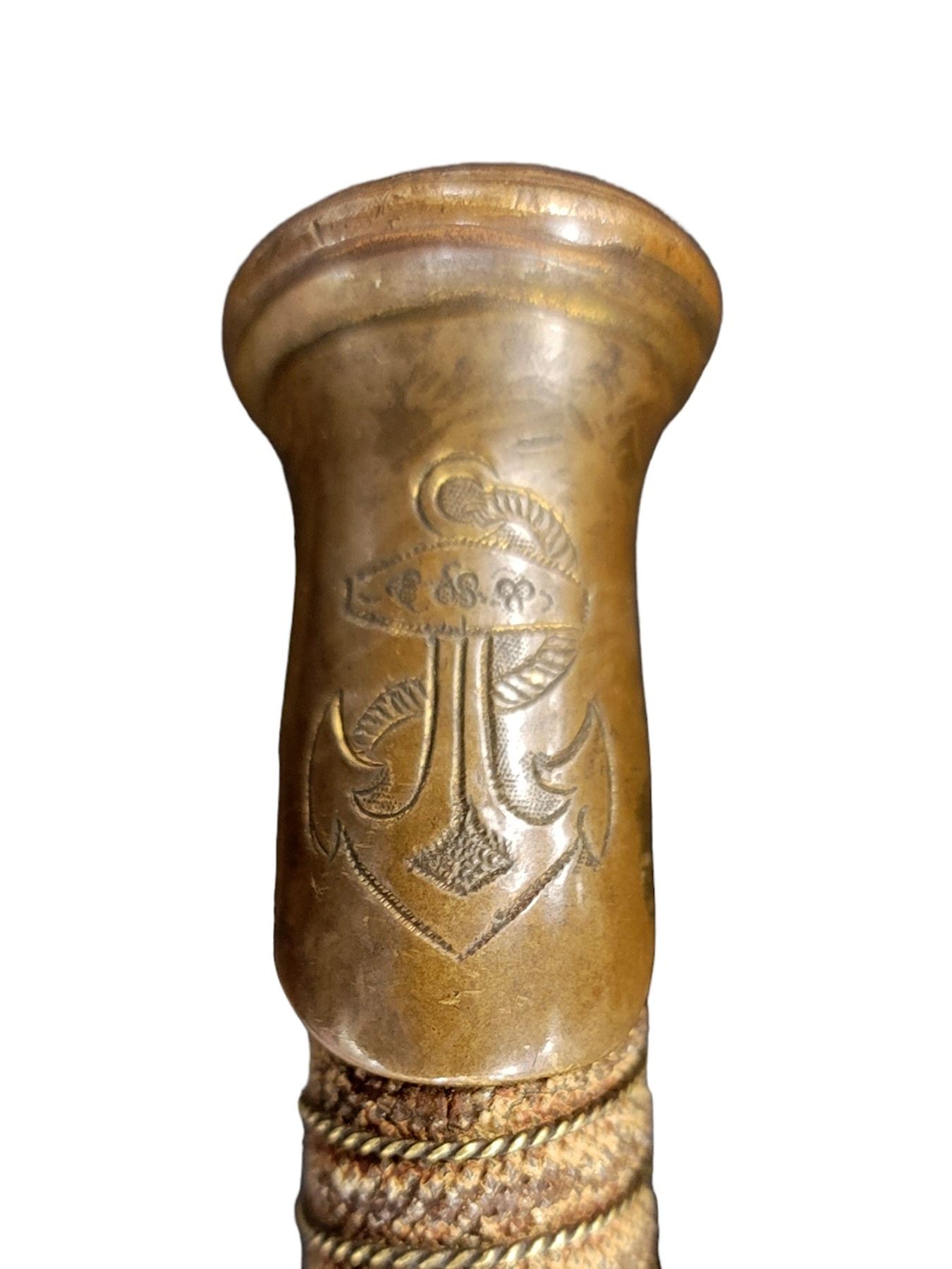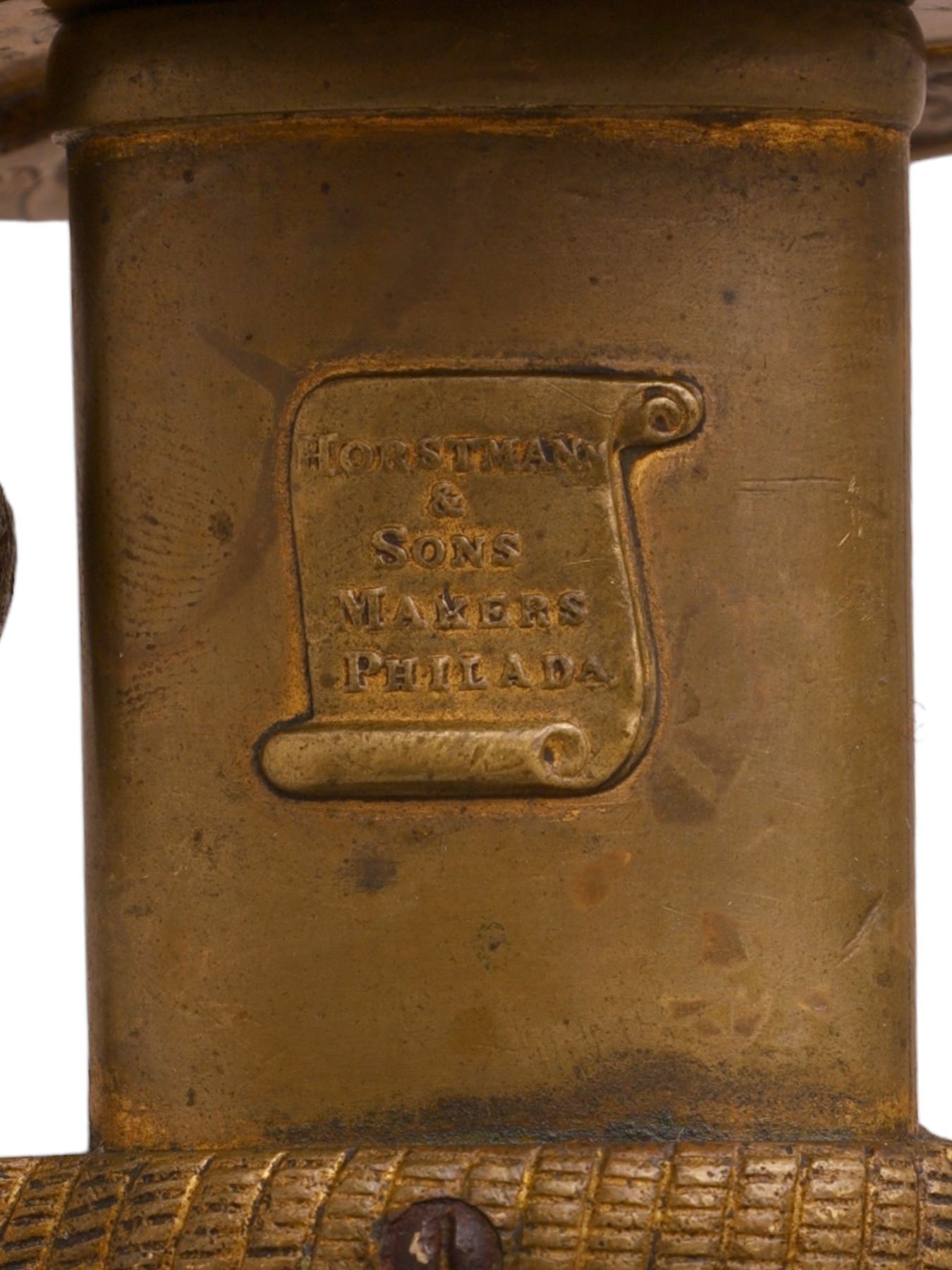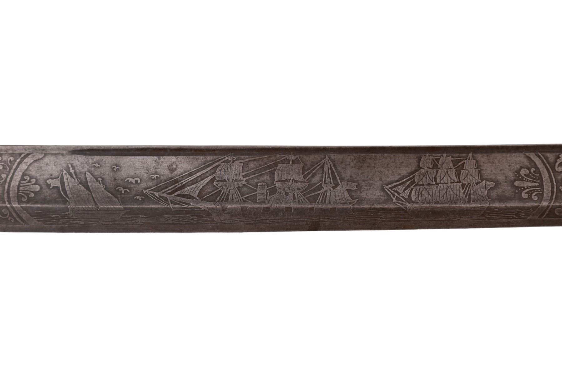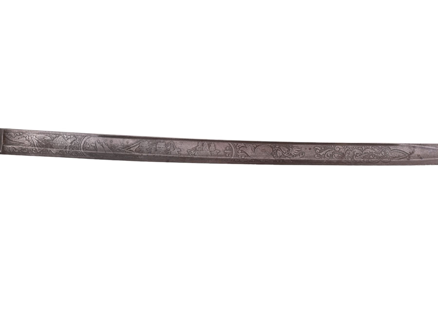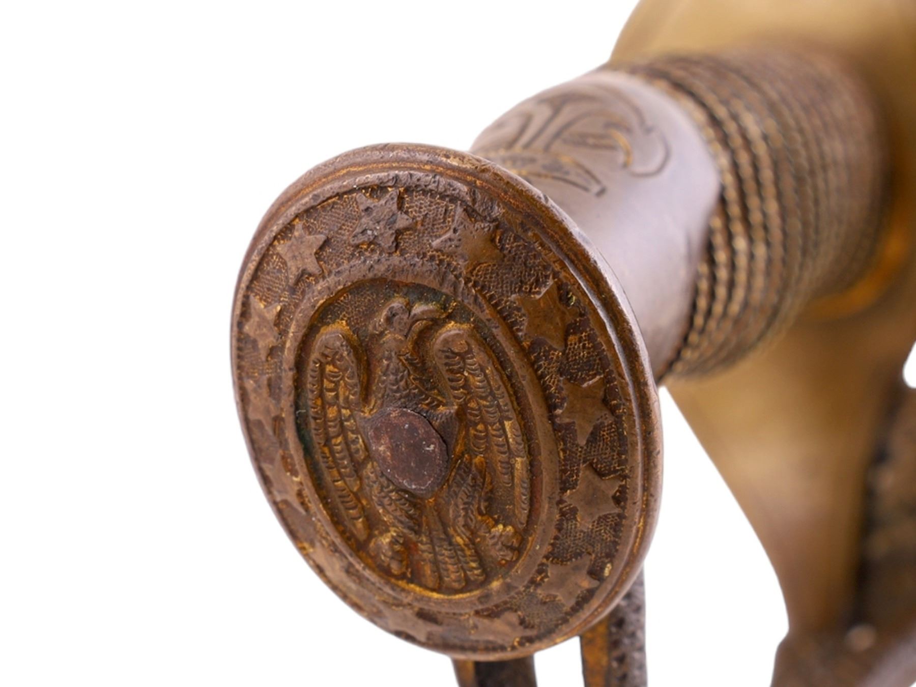 Civil War M1852 US Naval officer's sword and scabbard by Horstmann & Sons, PA. The blade is etched for two-thirds of its length with naval ships on one side and the USN and anchors. The blade is clean with very minor expected signs of wear, with the original buff leather washer. The sharkskin grip and wire wrap are excellent. The original sharkskin scabbard is in good condition. The pommel is engraved with an anchor, and the scabbard throat features a brass plaque with "Horstmann and Sons Makers Philadelphia".