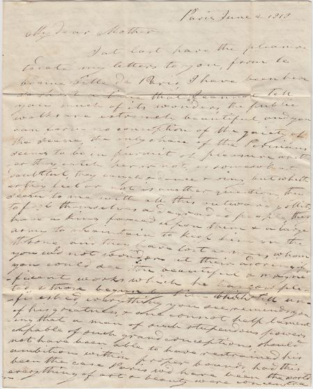 A.L.S. in an unknown hand, 3pp. + integral address leaf, Paris, June 2, 1818 addressed to "Mrs. John Joy" in Boston. The correspondent Mrs. Joy's son, writes in part: "...the public walks are extremely beautiful and you can form no conception of the gaiety of the scene, the only chase of the Parisians seems to be in pursuit of pleasure whether they catch her or not, is somewhat doubtful, they laugh & dance & sing but whether they feel or not is another question. They seem to me with all this outward jollity to feel themselves a degraded people. They have a king forced upon them & a large army to maintain to keep him on the throne and they have lost a many whom you would not wonder at their adoring if you could see the beautiful & magnificent works which he has completed & those begun by him...everything you see reminds you of his greatness, & one cannot help lamenting that a man of such stupendous power capable of such grand conceptions, should not have been able to have restrained his ambition within proper bounds, had this been the case Paris wd have been the world everything of art & beauty were concentrated and the genius of fine taste of the Emperor was continually adding to its beauties, & its wonder; the present king is the most popular of the Royal family, they feel his goodness & pity him but when he dies I should not be at all surprised if they sh'd kick up a row in travelling thro France there seems to be a feeling of desolation everything remains at a stand, no repairs are made, everything seems to be waiting if I may so express myself for some event, which is expected to take place, it seems to me as if every man which prevented him from lavishing anymore upon it than is absolutely necessary for the purposes of comfort... ". Heavy folds some with partial separations, losses to third page affecting text, light soiling, else very good condition.