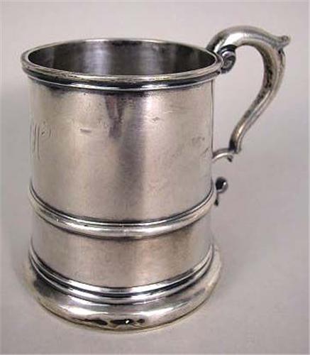 AN AMERICAN SILVER CHILDS' CUP; Marked on underside "G.R", and N.Y. in a rectangle, monogrammed "FLW", ringed body with scroll handle, 3-3/4"h, weight apx. 4 T.O.