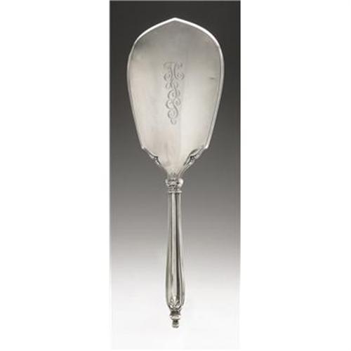 <B>AN AMERICAN SILVER HAND MIRROR</B></I><BR>Webster Company, North Attleboro, MA, Early Twentieth Century<BR><BR>Monogram to the reverse <I>HJS,</B></I> hallmark to the top of the handle with <I>STERLING</B></I><BR>14in. long x 4.5in. wide<BR><BR> <B>Condition Report:</B> Normal signs of wear as appropriate with age.<BR><BR><b>Shipping:</b> Hollowware/Pottery/Glass, Small (<a target="_blank" href="http://www.heritageauctions.com/common/shipping.php">view shipping information</a>)