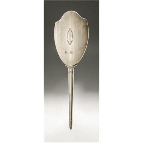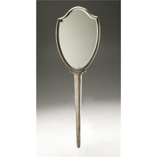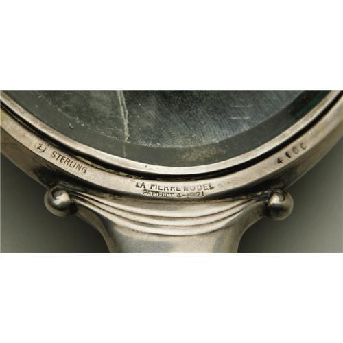 <B>AN AMERICAN SILVER HAND MIRROR</B></I><BR>La Pierre Mfg. Co., Newark, NJ, 1921<BR><BR>Monogram to the reverse <I>HMP,</B></I> hallmark to the front with <I>STERLING LA PIERRE MODEL 4100/PAT'D OCT 4-1921</B></I><BR>16in. long x 5in. wide<BR><BR> <B>Condition Report:</B> Normal signs of wear as appropriate with age.<BR><BR><b>Shipping:</b> Hollowware/Pottery/Glass, Small (<a target="_blank" href="http://www.heritageauctions.com/common/shipping.php">view shipping information</a>)