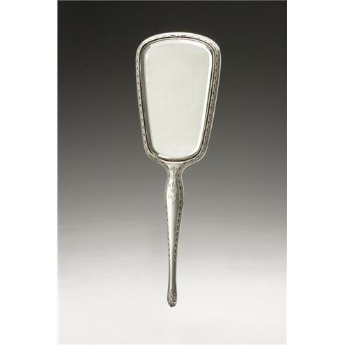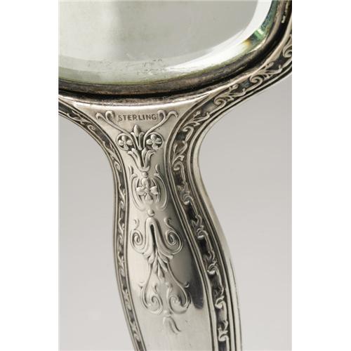 <B>AN AMERICAN SILVER HAND MIRROR</B></I><BR>Maker unknown, Early Twentieth Century<BR><BR>Marked to the top of the handle <I>STERLING</B></I><BR>13.8in. long x 4.4in. wide<BR><BR> <B>Condition Report:</B> Normal signs of wear as appropriate with age.<BR><BR><b>Shipping:</b> Hollowware/Pottery/Glass, Small (<a target="_blank" href="http://www.heritageauctions.com/common/shipping.php">view shipping information</a>)