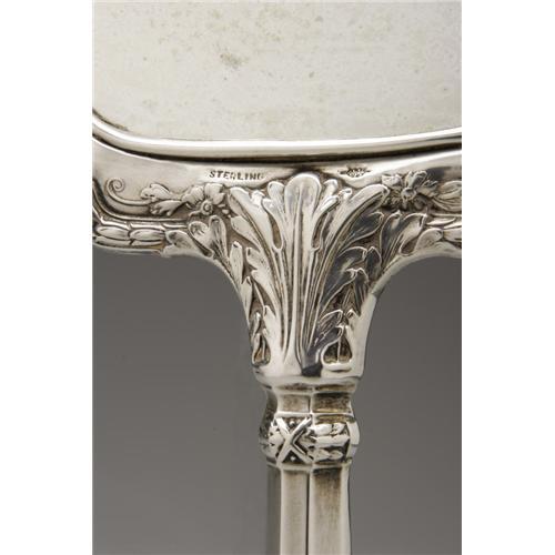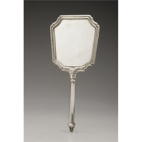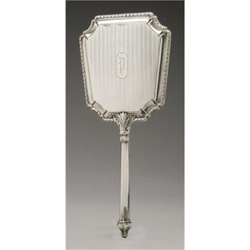 <B>AN AMERICAN SILVER HAND MIRROR</B></I><BR>Maker unknown, Early Twentieth Century<BR><BR>Monogram to the reverse <I>P,</B></I> unidentified hallmark to the handle with <I>STERLING</B></I><BR>12in. long x 5.3in. wide<BR><BR> <B>Condition Report:</B> Normal signs of wear as appropriate with age; the silver backing on the glass is slightly degraded.<BR><BR><b>Shipping:</b> Hollowware/Pottery/Glass, Small (<a target="_blank" href="http://www.heritageauctions.com/common/shipping.php">view shipping information</a>)