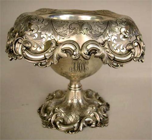 AN AMERICAN STERLING SILVER ROCOCO STYLE CENTERPIECE VASE; With scroll and stylized foliate motif, inscribed on base Nov. 3, 1909, three letter scroll monogram on front, 8-3/4"h x 11-1/2"dia., apx. 35 T.O., some dents
