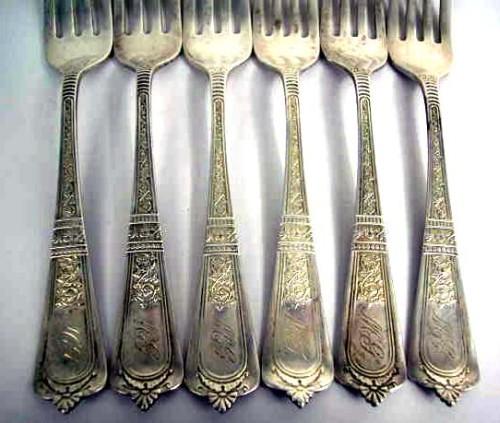 AN AMERICAN STERLING SILVER SET OF SIX DINNER FORKS, GORHAM "DOMESTIC PATTERN", 1880; Monogrammed, retailed by M. Scooler, 7"l, total weight apx. 8 T.O.