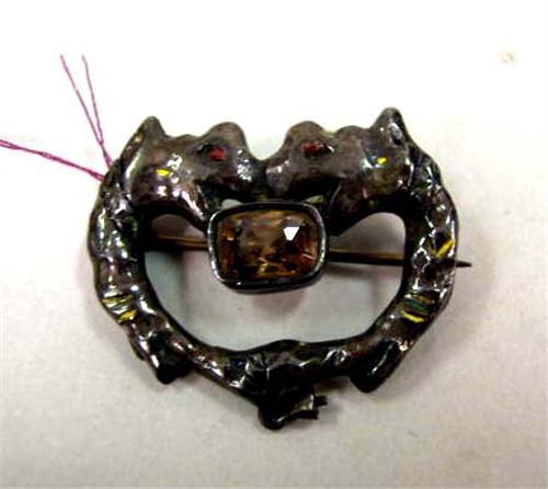 AN ANTIQUE GORHAM STERLING SILVER BROOCH, double snake-form crest set with faceted yellow stone, possibly citrine, stamped on the back with old lion, anchor and G Gorham mark, Sterling, #436, 1-1/4"W