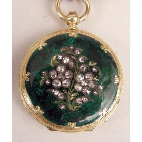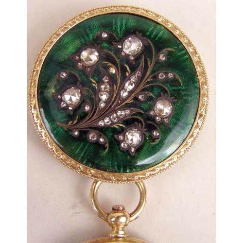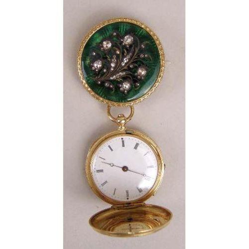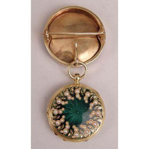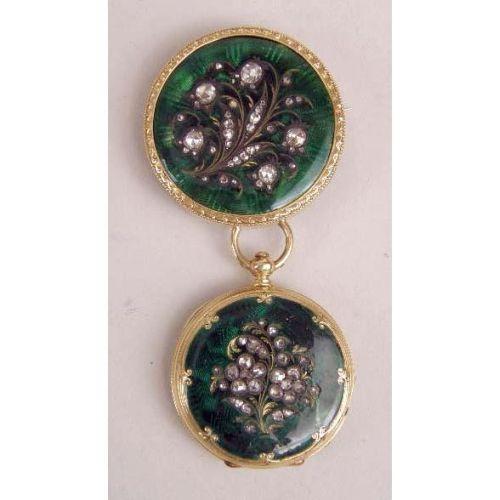 AN ANTIQUE YELLOW GOLD AND GREEN ENAMEL TWO PIECE PENDANT WATCH<BR><BR>One side with diamond flowers, the reverse with seed pearls, marked on the case F.W. & Co., J.C. Ledmole Geneve 13311, key wind, key missing, brooch, 1-1/4", watch 1"dia.