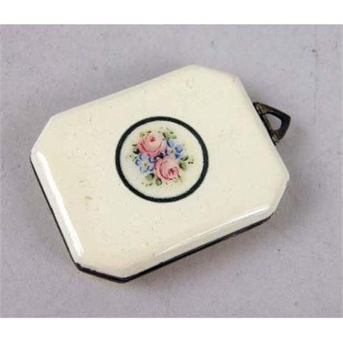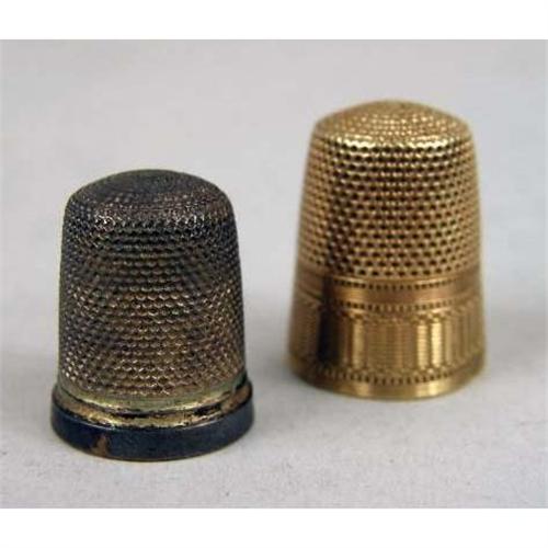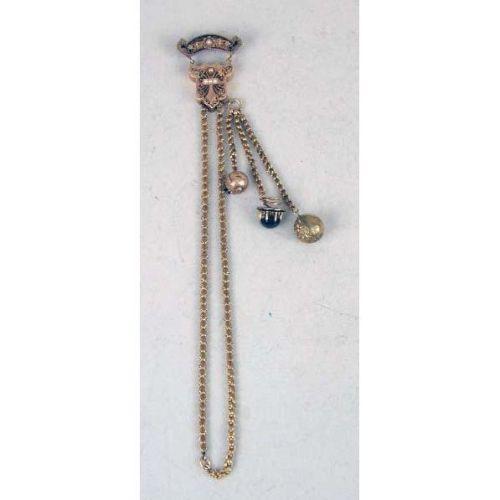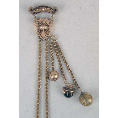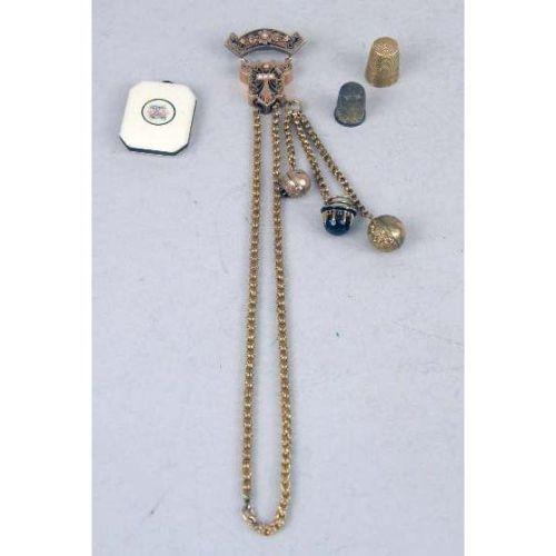AN ANTIQUE YELLOW GOLD, BLACK ENAMEL AND PEARL SLIDE<BR><BR>With gold chain and three fobs attached, slide set with pin, 1-1/2"l, chain, 7"l, together with a 14kt yellow gold thimble, a sterling silver thimble, and an enamel on sterling silver locket with floral motif