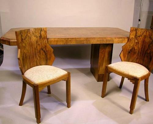 AN ART DECO FIGURED WALNUT DINING TABLE; Together with an accompanying set of six dining chairs, Probably German, the table of rectangular form with chamfered on two rectangular plinths, the chairs with bowed backs and seated rails on molded rectangular legs