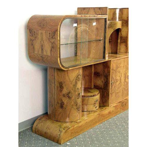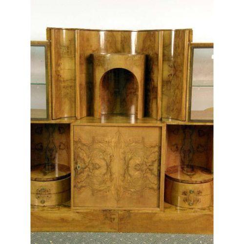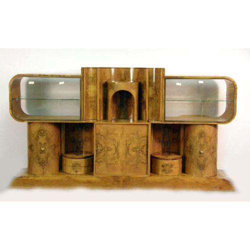 AN ART NOUVEAU MATCHBOOKED BURL WALNUT SIDEBOARD CABINET<BR><BR>French, fitted with cupboard doors opening to shelves, some wear, 4`7"h x 8`8"w x 18"d