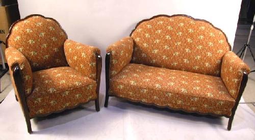 AN ART NOUVEAU THREE-PIECE SUITE OF SEATING FURNITURE; The scalloped back and apron joined by molded arms and stiles 4'length of settee