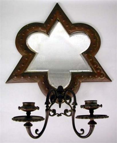 AN ARTS AND CRAFTS PATINATED METAL TWO-LIGHT MIRRORED WALL SCONCE; Tiffany & Co., of triangular and clover-leaf form with two scrolling candlearms and a beveled mirror plate 19"h x 14"w