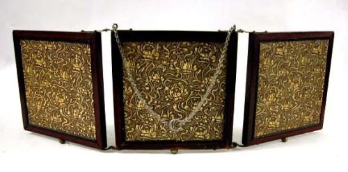 AN ARTS AND CRAFTS STYLE THREE-PART DRESSING MIRROR; The folding panels inspired by the designs of William Morris and each fitted with a beveled mirror plate Each panel 8"h x 8"w