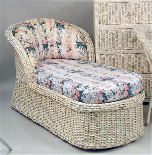 Comprising a chaise lounge with floral cushion, a desk and chair, a chest of drawers, and two more chairs. 6 pieces. Dresser: 42"h x 27"w x 18"d, Desk: 39"h x 40 1/2"w x 18 1/4"d, Chaise: 5`l