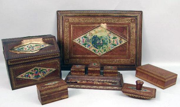Including a covered desk pad, a pen holder with nib and stamp boxes and a covered inkwell, two pens, a letter opener, a covered card box with two sets of playing cards, a blotter and letter holder. Together with a leather-covered, gilt-mounted cedar-lined box and two small boxes. 11 pieces. The blotter 14"h x 19"w Scattered losses and wear consistent with age and usage.
